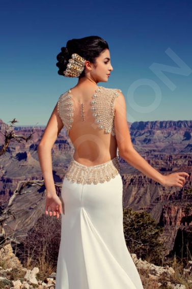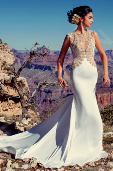 A gown worthy of Cleopatra herself, this gorgeous wedding gown embellished with Ancient motifs stands out thanks to its purity of line and exquisite décor. The almost-invisible sheer bodice in combination with the mermaid silhouette makes this gown a sight to behold.